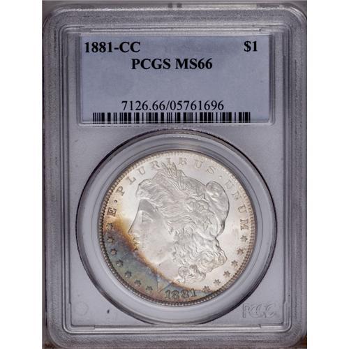 <B>1881-CC<img border='0' src='http://www.heritagecoins.com/images/star.gif' width=10 height=10>$1> MS66 PCGS.</B></I> Well struck with a pleasing layer of mint frost over both sides, and carefully preserved surfaces that are especially clean in the fields and on Liberty's cheek. A swath of aquamarine, red-brown, and lemon-gold iridescence lies across the lower left quadrant of the obverse. This visually enticing example has an unusually high degree of eye appeal, even for a Premium Gem.