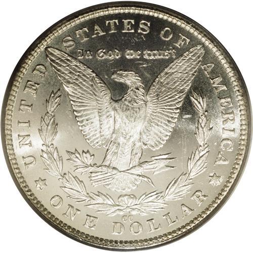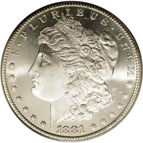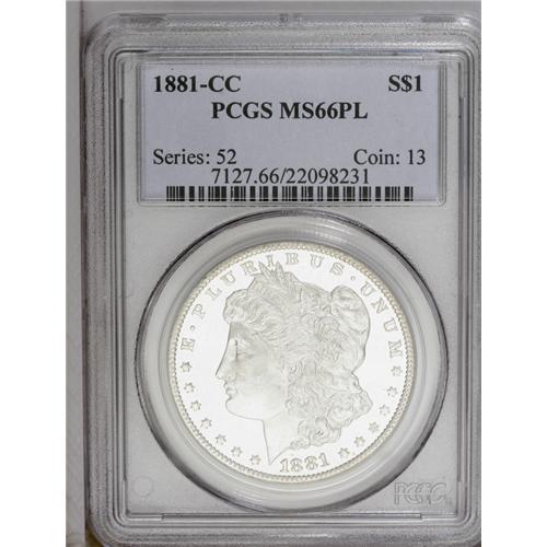 <B>1881-CC<img border='0' src='http://www.heritagecoins.com/images/star.gif' width=10 height=10>$1> MS66 Prooflike PCGS.</B></I> VAM-2. The die fill within the upper loop of the second 8 is reminiscent of the "8 Over Low 7" 1880-CC variety. A glittering prooflike Premium Gem with glassy, dynamically reflective fields and snow-white frosted devices. Essentially brilliant with a few wispy field marks on each side, the piece is fully struck and shows excellent detailing above Liberty's ear as well as on the eagle's breast feathers. Population: 22 in 66 Prooflike, 0 finer (2/06).
