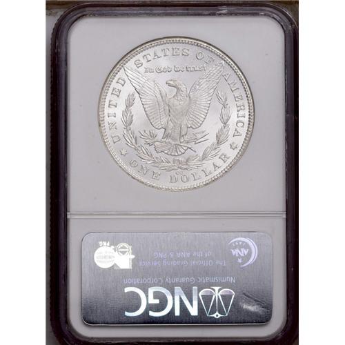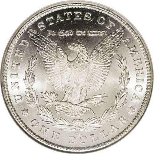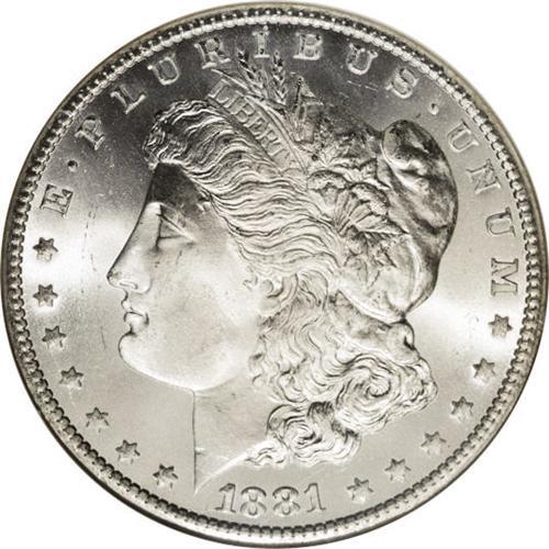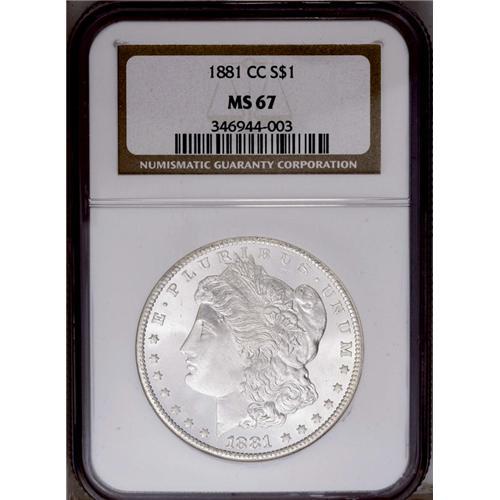 <B>1881-CC<img border='0' src='http://www.heritagecoins.com/images/star.gif' width=10 height=10>$1> MS67 NGC.</B></I> A brilliant and frosty Superb Gem example with bright silver surfaces and sharp design features. Although hardly rare, examples at this grade level are seldom offered. Due to the handling involved in annual inventories, most of the survivors from the Treasury Hoard are considerably bagmarked. Very few examples survived this process with pristine surfaces. Census: 82 in 67, 3 finer (4/06).