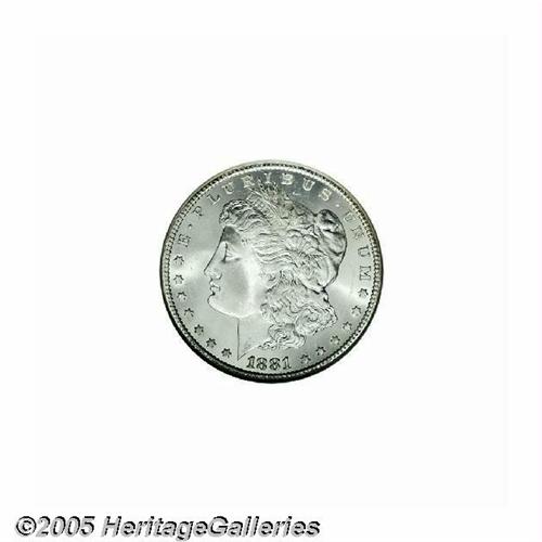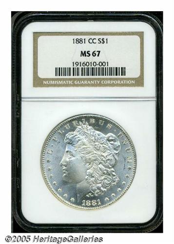 <B>1881-CC<S$1> MS67 NGC.</B></I> A brilliant and semi-prooflike Superb Gem, nicely struck and void of relevant marks. The 1881-CC is a perennial favorite among collectors; due to its Carson City origin, its mintage below 300,000 pieces, and its availability in attractive Mint State grades, courtesy of the GSA hoard.