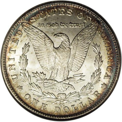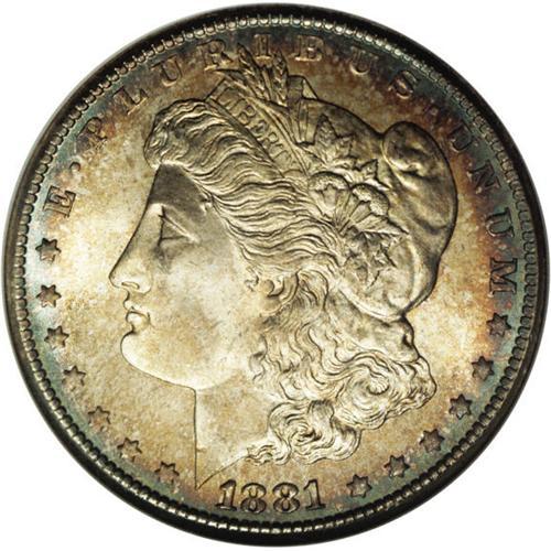 <B>1881-CC<img border='0' src='http://www.heritagecoins.com/images/star.gif' width=10 height=10>$1> MS67 NGC.</B></I> A stunning Superb Gem example of this low-mintage (296,000 pieces) Carson City issue. This piece displays virtually no abrasions and outstanding eye appeal. It is colorfully toned over the obverse and part of the obverse, with outstanding frosty luster that is characteristic of the issue. A beautiful coin that could represent this issue in even the finest of Morgan dollar sets.