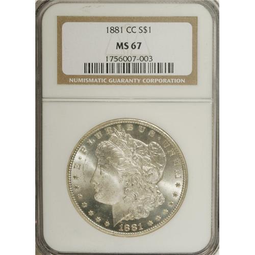 <B>1881-CC S$1 MS67 NGC.</B></I> Essentially brilliant with a thick layer of ebullient mint frost covering both sides, this is a beautiful icy-white Superb Gem. The design features are sharply struck, and surface disturbances are absolutely minimal. According to noted expert Wayne Miller: "On the whole, the 1881-CC is probably the highest quality Morgan dollar struck at the Carson City mint. This is due to the low mintage, which allowed more time per coin for production, and to the fact that the Carson City mint struck fewer coins per die pair than any of the mints." In fact, a mere 296,000 pieces were produced.<BR><BR><b>Shipping:</b> Coins & Currency (<a target="_blank" href="http://www.heritageauctions.com/common/shipping.php">view shipping information</a>)