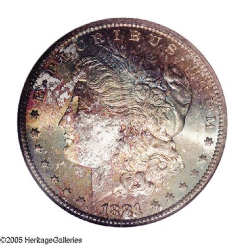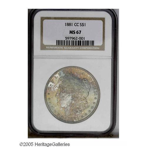 <B>1881-CC<S$1> MS67 NGC.</B></I> Orange-red, apple-green, and sky-blue colors consume the obverse of this lustrous and pinpoint-sharp Superb Gem. The reverse has only a hint of gold toning. The portrait, the right obverse field, and the reverse are essentially immaculate, and only a single faint mark is on the left obverse field. A beautifully toned representative of this popular low mintage issue.