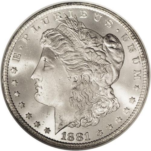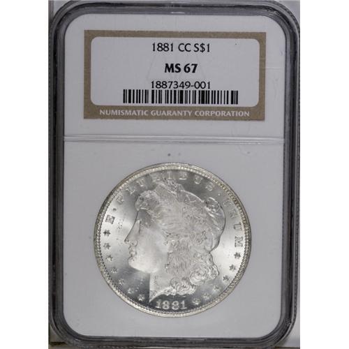 <B>1881-CC<img border='0' src='http://www.heritagecoins.com/images/star.gif' width=10 height=10>$1> MS67 NGC.</B></I> The cheek of Liberty is free of even the tiniest abrasions. Indeed, even under a loupe there are no visible abrasions on this phenomenally appealing Superb Gem. The strike is bold, both sides are brilliant, it is difficult to conceive of a finer piece. Perhaps only a few tiny luster breaks prevent an even finer grade. Census: 85 in 67, 3 finer (9/06).