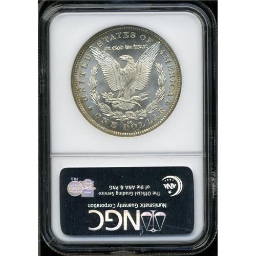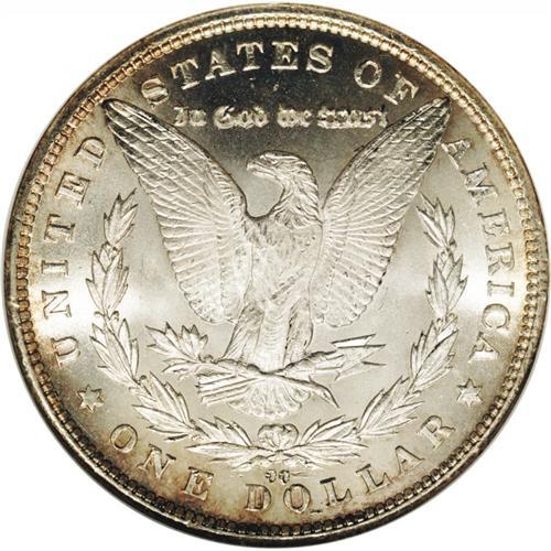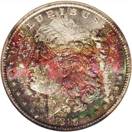 <B>1881-CC<img border='0' src='http://www.heritagecoins.com/images/star.gif' width=10 height=10>$1 MS67 NGC.</B></I> The obverse of this memorable Carson City dollar entwines a variety of iridescent hues, including emerald-green, bright rose, and coppery-orange. Only a small section near the top of the portrait to the borders between 11 o'clock and 1 o'clock is left brilliant. The impeccable, frosty reverse has just a touch of golden color at the edges. Great color and Superb quality, all wrapped up into one neat little package. Census: 73 in 67, 3 finer (1/06).