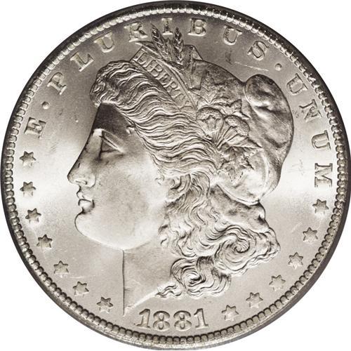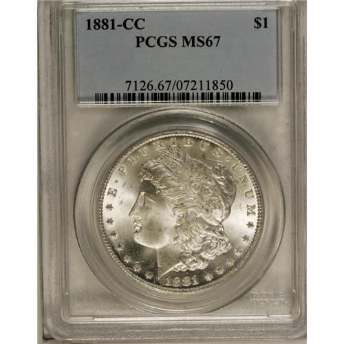 <B>1881-CC S$1 MS67 PCGS.</B></I> Among Carson City Mint Morgan dollars released by the GSA, the 1879 through 1881 issues are much scarcer than others. Although this piece is not designated as a GSA coin, it almost certainly is just such a piece. Both sides have intensely brilliant silver luster with frosty surfaces. Aside from a few miniscule ticks, the surfaces are pristine. PCGS has only certified three examples of this date in finer grades (10/06).<BR><BR><b>Shipping:</b> Coin/Currency (<a target="_blank" href="http://www.heritageauctions.com/common/shipping.php">view shipping information</a>)