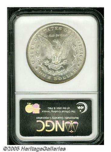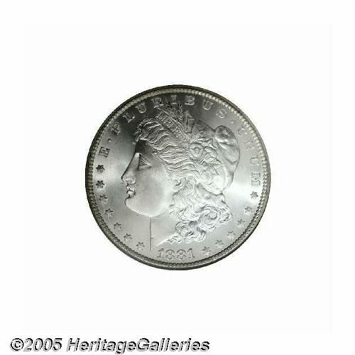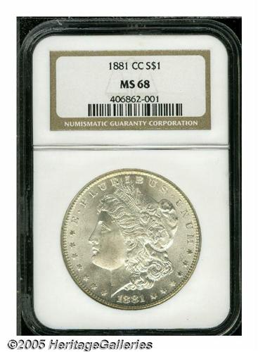 <B>1881-CC<S$1> MS68 NGC.</B></I> We have only offered two other different MS68 examples of this date, the Jack Lee coin and the Mike Casper coin. Both were some time ago and we cannot say for certain, but our inclination is to say that neither was cleaner than this exceptional coin. Bright, even mint frost covers each side with no trace of toning. The surfaces are nearly flawless with no mentionable or noticeable abrasions on either side, just a few very shallow luster grazes that do not have any effect on the coin's overall appearance or desirability. Fully struck also with pinpoint definition over Liberty's ear as well as the breast feathers of the eagle. Population: 2 in 68, 0 finer (6/05).