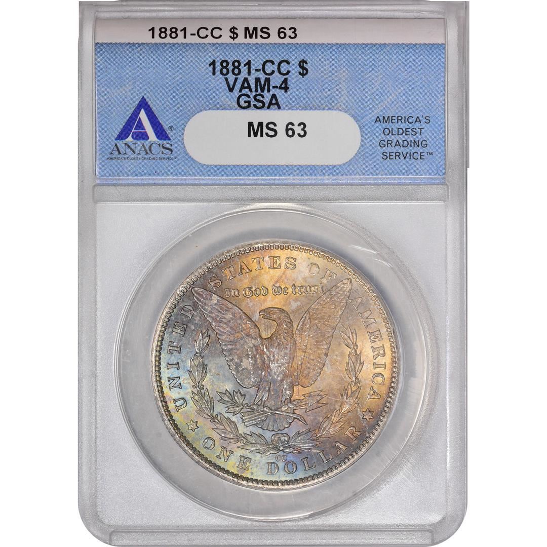 One 1881-CC VAM-4 $1 Morgan Silver Dollar Coin ANACS MS63 GSA Amazing Toning. ANACS Certified.