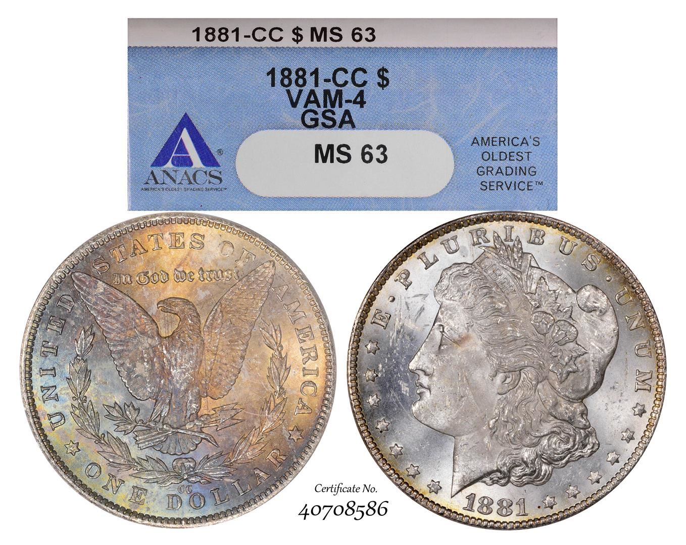 One 1881-CC VAM-4 $1 Morgan Silver Dollar Coin ANACS MS63 GSA Amazing Toning. ANACS Certified.