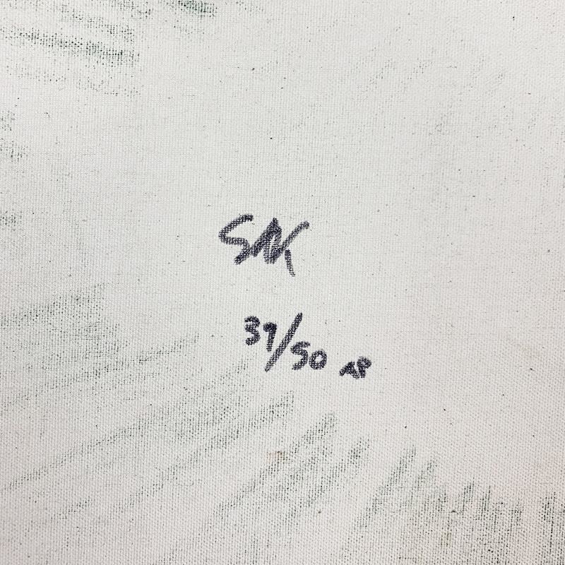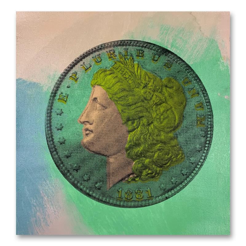 "1881 Coin " is a limited edition hand pulled silkscreen mixed media on canvas by Andy Warhol protege Steve Kaufman (1960-2010). This piece is numbered and AP 39/50 and hand signed inverso. Includes letter of authenticity. As is common with Kaufman's works, this piece may have perceived minor flaws, but is in overall good condition. Measures approximately 15" x 14" (image).