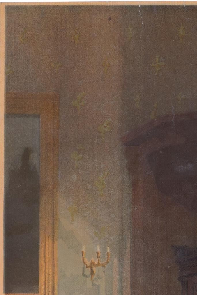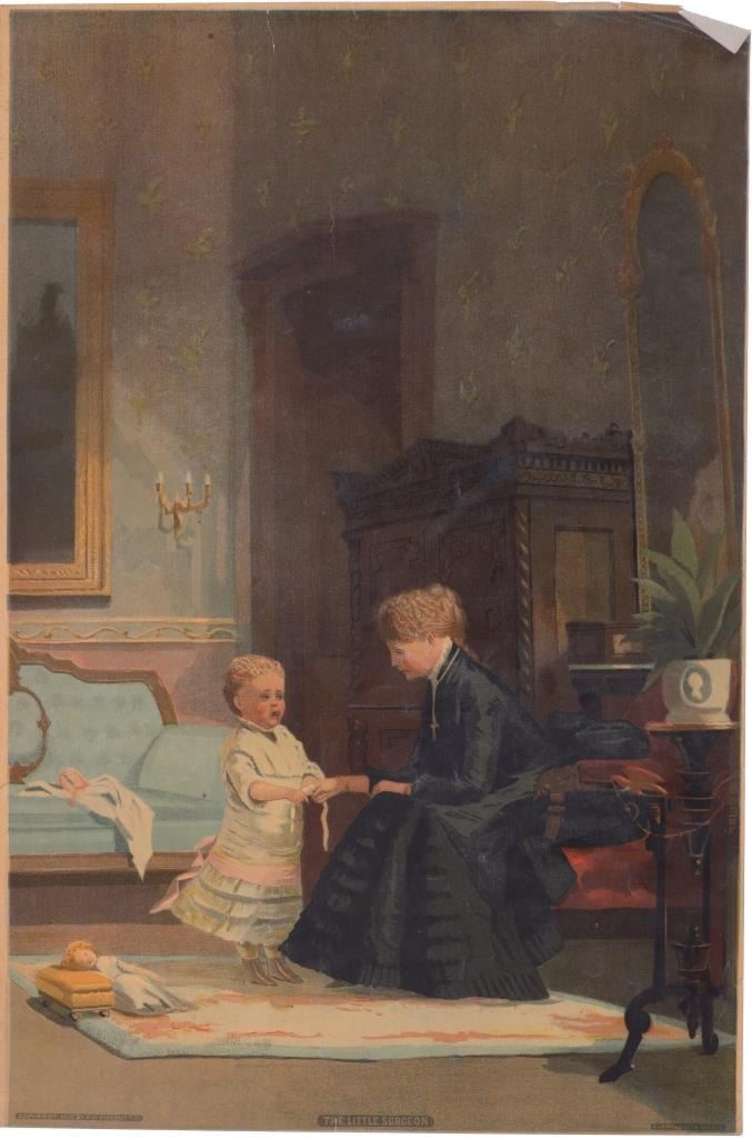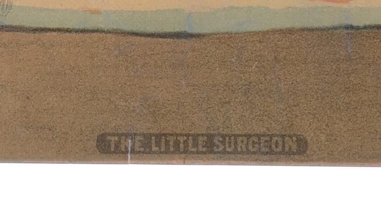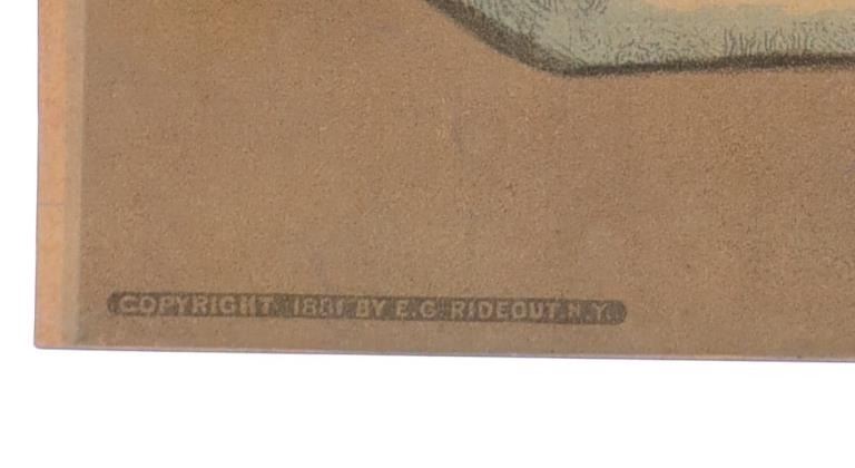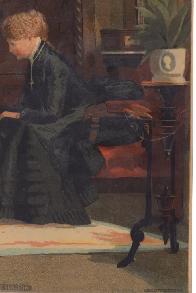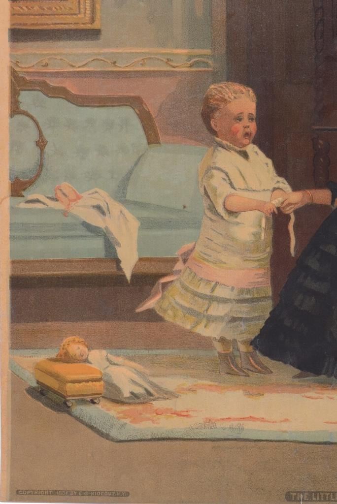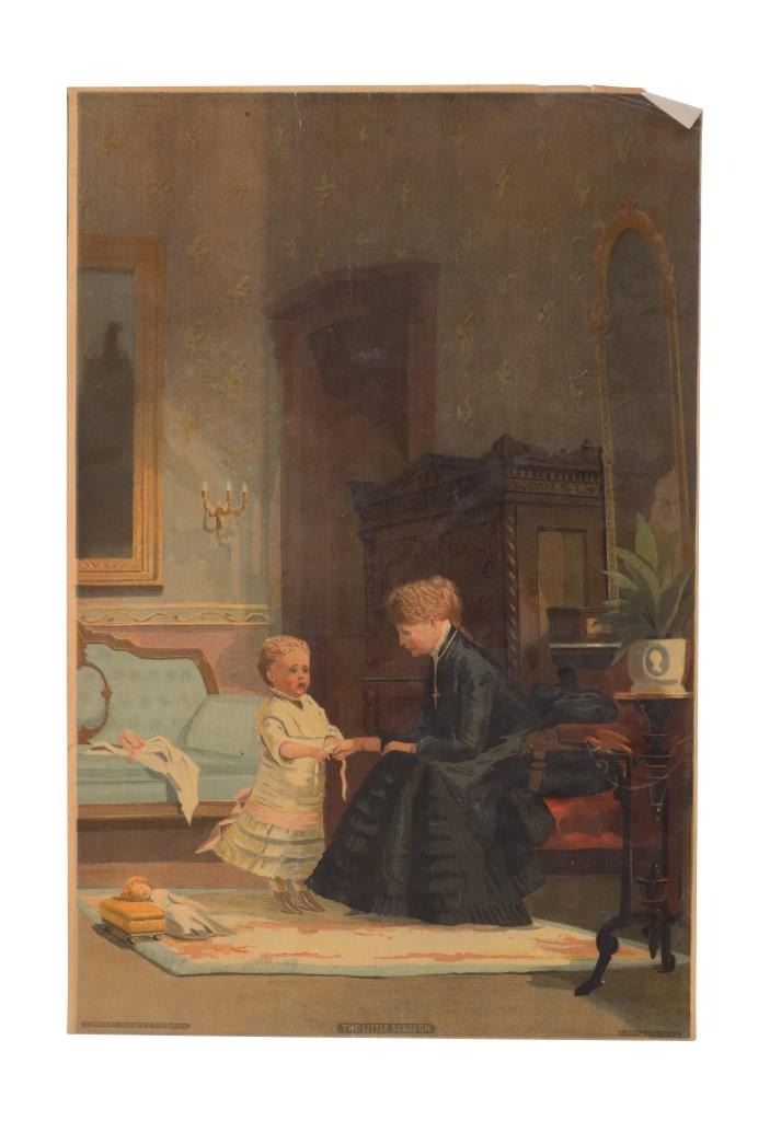 Featured in this lot is this original 1881 E.G. Rideout lithograph titled, "The Little Surgeon", printed by Cadwell Lithography and copy-righted by E.G. Rideout in 1881 in New York. The litho shows a mother and her child sitting in a large Victorian style room. The woman is wearing an all black dress and cross necklace as she sits on a chair while her child "tends" to her finger as if the child was a "Little Surgeon". The lithograph is printed on woven linen paper. The bottom left hand corner of the litho reads, "Copyright 1881 by E.G. Rideout N.Y.", while the bottom center shows the title reading, "The Little Surgeon". The bottom right hand corner reads, "Cadwell Litho. N.Y.". The lithograph shows good condition for its antique age with slight bending to one corner and fading to the coloring but shows no signs of obvious damage. The litho measures 21" L x 13 15/16" W.