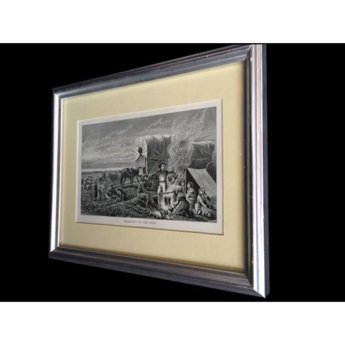 Print engraving illustration from " A Popular History of The United States" by William Cullen Bryant & Sydney Howard Gay. New York: Scribner's Sons, 1881, p.31. Depicts emigrants migrating west - a pioneer family,with covered wagon, cooking over a fire & cattle grazing in the background. Matted & framed under glass in a 9" X 11" silver gilt wood frame.
