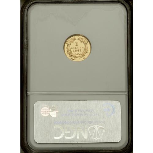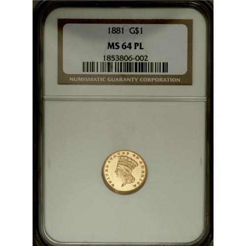 <B>1881 G$1 MS64 Prooflike NGC.</B></I> Solidly struck with exceptional reflectivity and modest contrast. Most of this issue's 7,600 pieces have somewhat prooflike surfaces, though few have the shine of this example's yellow-gold fields. Census: 4 in 64 Prooflike, 5 finer (11/06).<BR><BR><b>Shipping:</b> Coin/Currency (<a target="_blank" href="http://www.heritageauctions.com/common/shipping.php">view shipping information</a>)
