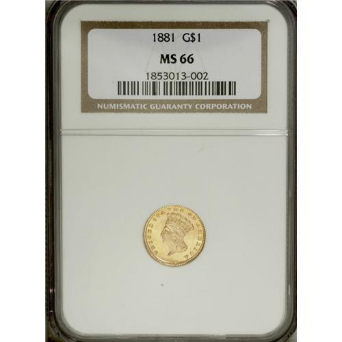 <B>1881 G$1 MS66 NGC.</B></I> The high overall level of preservation for this issue is demonstrated by our past results: of more than 50 examples offered, only one was not Mint State. This example is solidly struck and has the partially prooflike fields that characterize most of the mintage.<BR><BR><b>Shipping:</b> Coin/Currency (<a target="_blank" href="http://www.heritageauctions.com/common/shipping.php">view shipping information</a>)