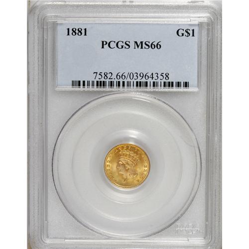 <B>1881 G$1 MS66 PCGS.</B></I> Lovely prooflike surfaces display variegated mint-green and peach-gold coloration that covers radiant luster. A sharp, even strike is seen throughout, and there are no significant marks to report.<BR><BR><b>Shipping:</b> Coins & Currency (<a target="_blank" href="http://www.heritageauctions.com/common/shipping.php">view shipping information</a>)