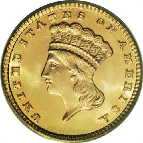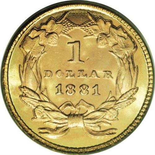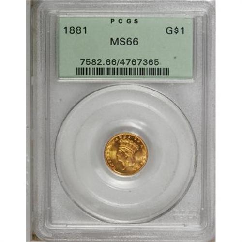 <B>1881 G$1 MS66 PCGS.</B></I> Rich apricot-gold color imbued with traces of light green and rose embraces this lovely Premium Gem. Semi-prooflike fields highlight the exquisitely struck motifs, and both faces are impeccably preserved. Housed in a green-label holder. Beautiful overall eye appeal.<BR><BR><B>Coin Engraver:</B> James B. Longacre<BR><BR><b>Shipping:</b> Coins & Currency (<a target="_blank" href="http://www.heritageauctions.com/common/shipping.php">view shipping information</a>)
