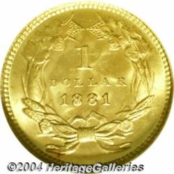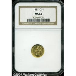 <B>1881<G$1> MS67 NGC.</B></I> A flashy jewel with lovely honey and olive-gold hues. Meticulously struck, and virtually devoid of contact. The 8s in the date show recutting (as made) inside the loops. Just 7,620 pieces were struck, although a few of these were undoubtedly set aside as souvenirs at the time of issue. Population: 59 in 67, 24 finer (6/04). <BR><BR><B>Important notice:</B> Heritage usually auctions material at the rate of 200-250 lots per hour. On some occasions eBay Live bid software or the Internet may not be able to keep up with the pace of the auction. We recommend placing a realistic absentee bid now as insurance to avoid disappointment. Occasionally the auctioneer may eliminate or reject an eBay Live bid, and the auctioneer may also reopen a lot after the close of the eBay live bidding (usually because we missed an audience bid), and may reject your bid even if it shows you as the winning bidder. By bidding via eBay Live, you agree that Heritage may award the lot to another bidder at its sole discretion under the circumstances described above or any other reasonable circumstances. Since eBay bids are not shown to us until we open the lot on the floor, we treat those bids just like floor bids. In most cases the floor responds before the eBay bid is presented to us, due to Internet lag time, so for consistency we have made it a policy that floor bids are always considered first over tie eBay live bids. Also please note that all Heritage lots purchased through eBay Live carry a 20% Buyer's Premium. Please make sure you read the Terms and Conditions before you bid. </span></font></tr></table></td></tr></table>