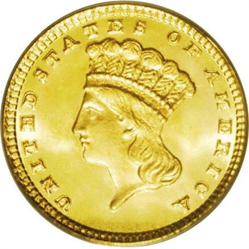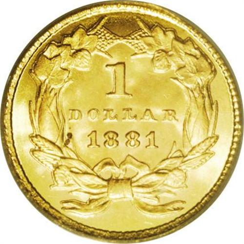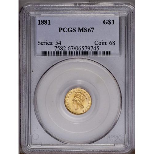 <B>1881<G$1> MS67 PCGS.</B></I> This golden-rose Superb Gem is awash in scintillating, frosty textured luster. As such, it is probably a later striking (as far as an issue with just 7,620 business strikes can have later strikings) since most survivors are semi, if not fully prooflike. Neither inadequate striking definition nor grade-limiting abrasions are a problem in any area. We wholeheartedly recommend this coin to high quality gold specialists and type collectors alike.