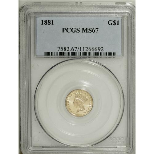 <B>1881 G$1 MS67 PCGS.</B></I> This spectacular Superb Gem looks as if it were struck yesterday. The flashy fields are essentially immaculate, and the strike is intricate despite a hint of incompleteness on the wreath bow. A wonderful representative of this scarce issue, which has a mintage of only 7,620 pieces.<BR><BR><b>Shipping:</b> Coins & Currency (<a target="_blank" href="http://www.heritageauctions.com/common/shipping.php">view shipping information</a>)