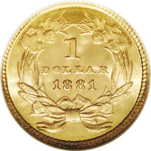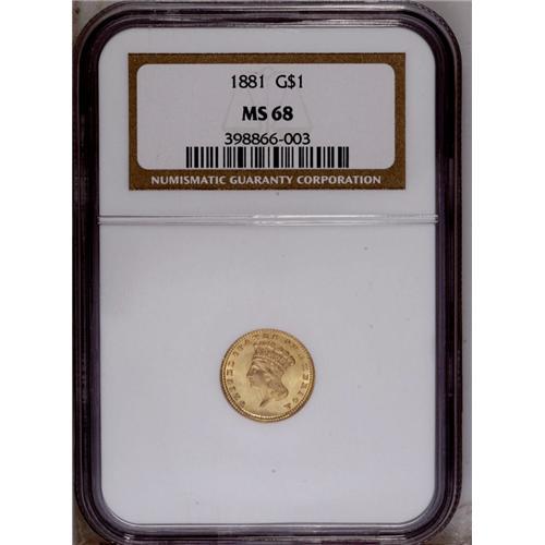 <B>1881 G$1 MS68 NGC.</B></I> The first of two exemplary examples of this normally well preserved, low mintage date. A riveting semi-reflective sheen greets the viewer and both sides continue the dramatic effect, having been spared from all but the tiniest surface imperfections. Census: 37 in 68, 3 finer (1/06).
