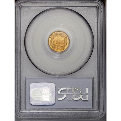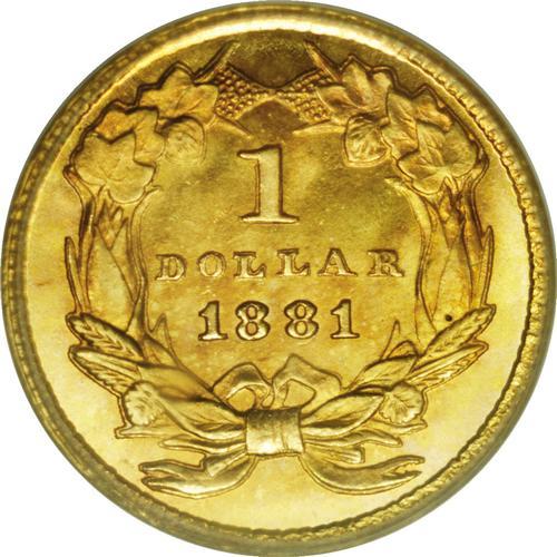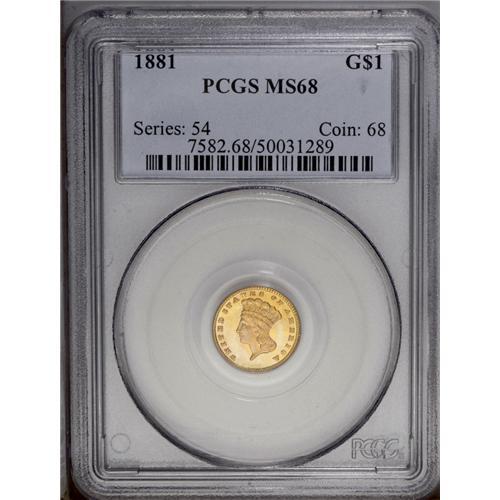 <B>1881 G$1 MS68 PCGS.</B></I> Captivating semi-reflective surfaces appear to be essentially as struck, being delicately accented in natural golden-orange patina. The high production standards employed by the Philadelphia Mint during the striking of just 7,620 business strikes issued for the year combined with the fact that hundreds of pieces were hoarded at the time of issue has proven to be a bonanza for today's quality-conscious collector. This spectacular example represents virtually unsurpassable quality for this or any other date in the gold dollar series. Population: 31 in 68, 0 finer (1/06).