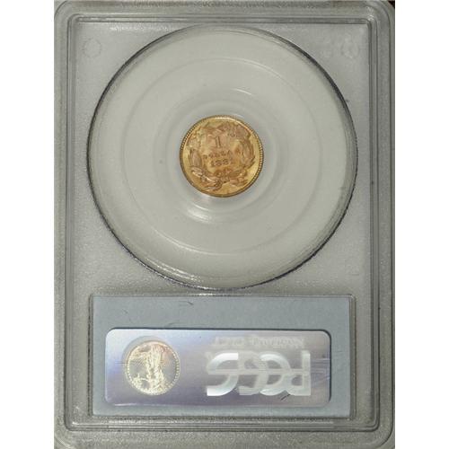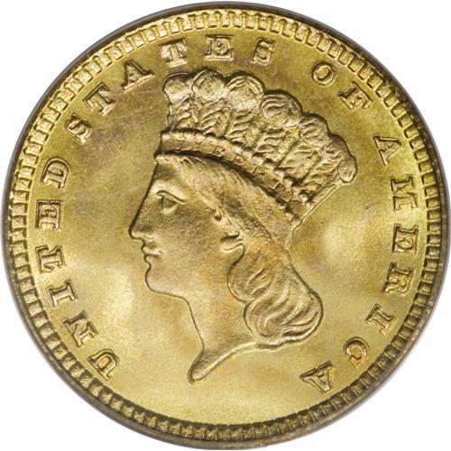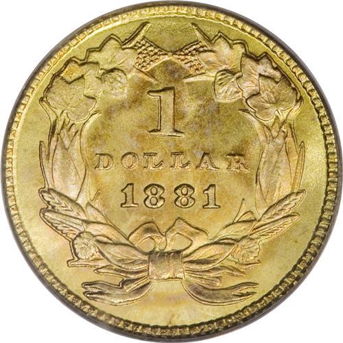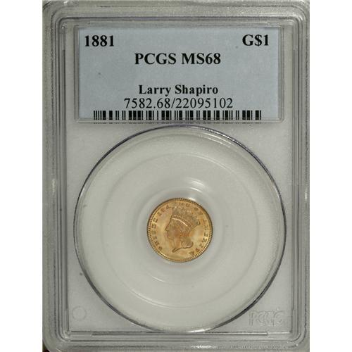 <B>1881 G$1 MS68 PCGS.</B></I> Ex: Larry Shapiro. Satiny surfaces, mottled orange-gold patina, and excellent sharpness grace this outlandishly preserved specimen. The fields are virtually free of even the most inconsequential blemish, and the only distraction (if you can call it that), is some blurriness in the denticles on the left side of the reverse. Only 7,620 business strikes were coined. Population: 36 in 68, none are finer (4/07).<BR><BR><b>Shipping:</b> Coins & Currency (<a target="_blank" href="http://www.heritageauctions.com/common/shipping.php">view shipping information</a>)