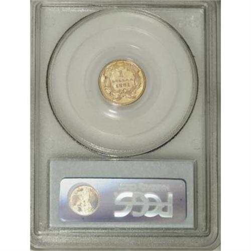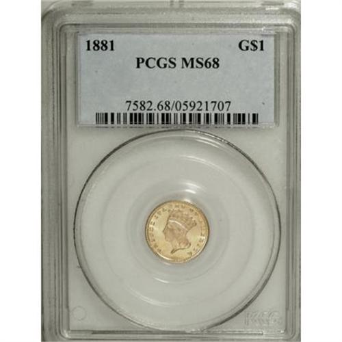 <B>1881 G$1 MS68 PCGS.</B></I> Care must be taken when quoting mintage figures for early U.S. coins. The recorded amounts generally refer to the number of coins struck in a given calendar year, regardless of the actual date on the coin. Additionally, coins were sometimes struck, recorded, and subsequently melted, thus creating a false sense of how many coins actually left the Mint. With a recorded mintage of 7,260 pieces, the 1881 gold dollar is, by any standard, a low mintage coin. However, the total may actually be lower. The PCGS <I>Population Report</B></I> indicates that the 1880 gold dollar, with a recorded mintage of 1,600 pieces, is of comparable rarity to 1881-dated coins. This piece displays stunning, frosty peach-gold surfaces that show essentially no evidence of post-strike contact. Population: 38 in 68, 0 finer (7/07).<BR><BR><B>Coin Engraver:</B> James B. Longacre<BR><BR><b>Shipping:</b> Coins & Currency (<a target="_blank" href="http://www.heritageauctions.com/common/shipping.php">view shipping information</a>\)