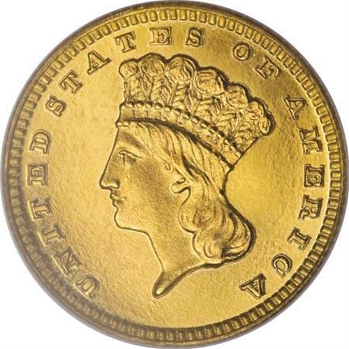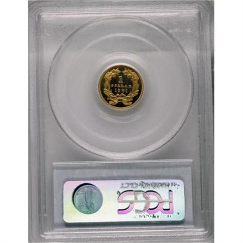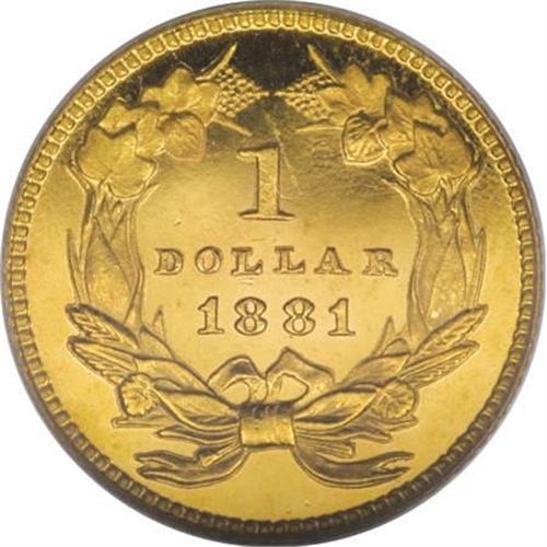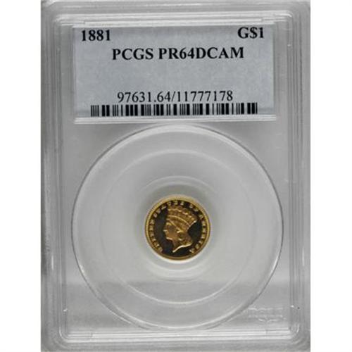 <B>1881 G$1 PR64 Deep Cameo PCGS.</B></I> Unmistakably a proof--with high, fully squared rims on both sides, and crisp details throughout--although not all of the Breen <I>Proof Encyclopedia </B></I>diagnostics match: "Widely spaced date. B-1. Heavy letters, partial extra outlines. Rev. 1 centered below O, second 8 below L; wreath tops joined; recuttings within 8's at r." <BR> While on this coin the date is widely spaced and the letters are heavy with extra outlines, there is no obvious recutting, the wreath tops are separate, and while the 1 is more or less beneath the O, the second 8 is to the right of the L. Could this be a second proof die, for this small mintage of 87 coins? The orange-gold surfaces show stark field-device contrast, and the coin offers gorgeous eye appeal. Perhaps only a couple of tiny reverse contact marks prevent a finer grade, as the obverse appears choice for the PR64 level. Population: 5 in 64 Deep Cameo, 5 finer (7/07).<BR><BR><b>Shipping:</b> Coins & Currency (<a target="_blank" href="http://www.heritageauctions.com/common/shipping.php">view shipping information</a>\)