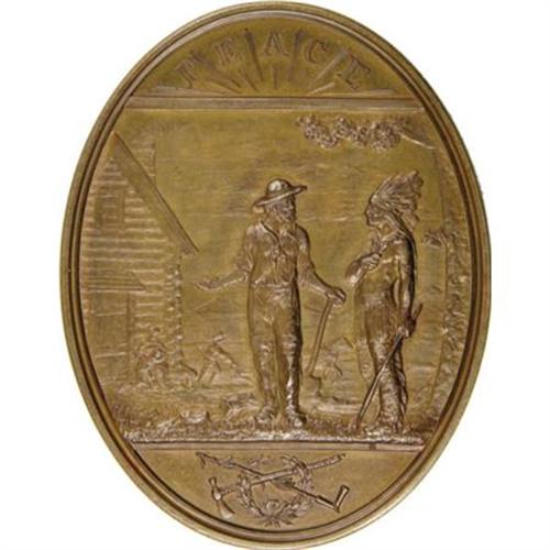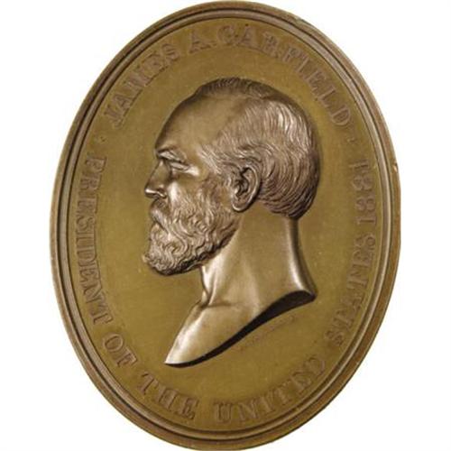 <B>1881 James Garfield Indian Peace Medal, Julian IP-44, Near-Gem Uncirculated Uncertified.</B></I> Bronzed copper oval, 75.3 mm x 59.2 mm, 182.5 gm (2815.4 gn). Obverse: Bust left, JAMES A. GARFIELD PRESIDENT OF THE UNITED STATES 1881. Signed C.E. BARBER F., for Charles Barber. Reverse: Settler shows Native American his homestead, wife nursing baby, son plowing in background. Matte center, with mirrored, highly reflective top and bottom cartouches depicting PEACE and pipe, tomahawk, and wreath, respectively. Prooflike throughout. The obverse has brilliantly mirrored and prooflike surfaces with matte high-relief devices, a Gem save for a tiny rim bump noted above the F in GARFIELD. The central reverse scene is mattelike, as noted, with brilliant top and bottom. There are no mentionable surface impairments noted on either side, and it is difficult to conceive of another example that could significantly better this piece. The Ford specimen (Stack's, Sale XVIII, 5/2007, lot 167), Choice Uncirculated, realized $2,760, and this nicer piece should fetch a higher price.<BR><BR><b>Shipping:</b> Coins & Currency (<a target="_blank" href="http://www.heritageauctions.com/common/shipping.php">view shipping information</a>)