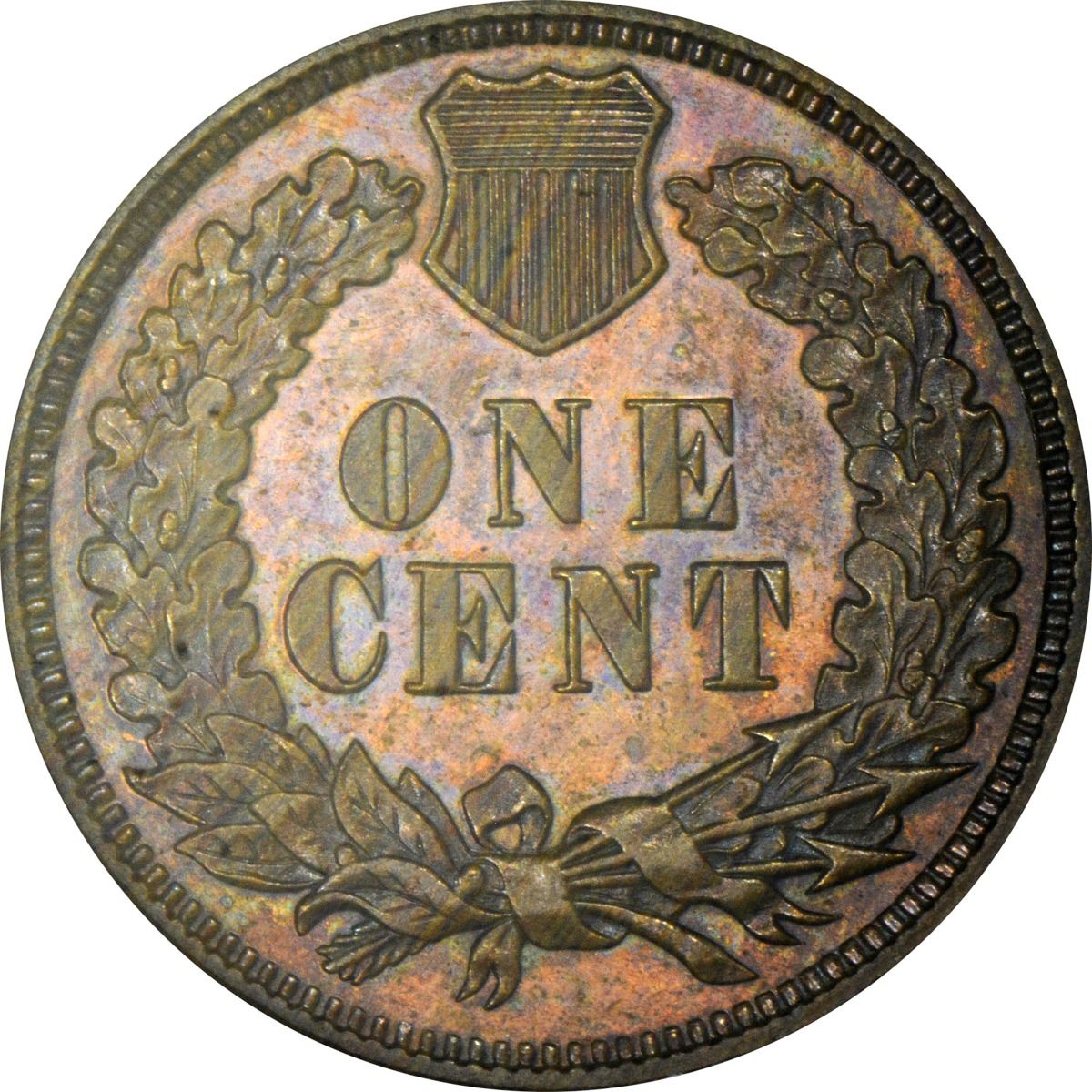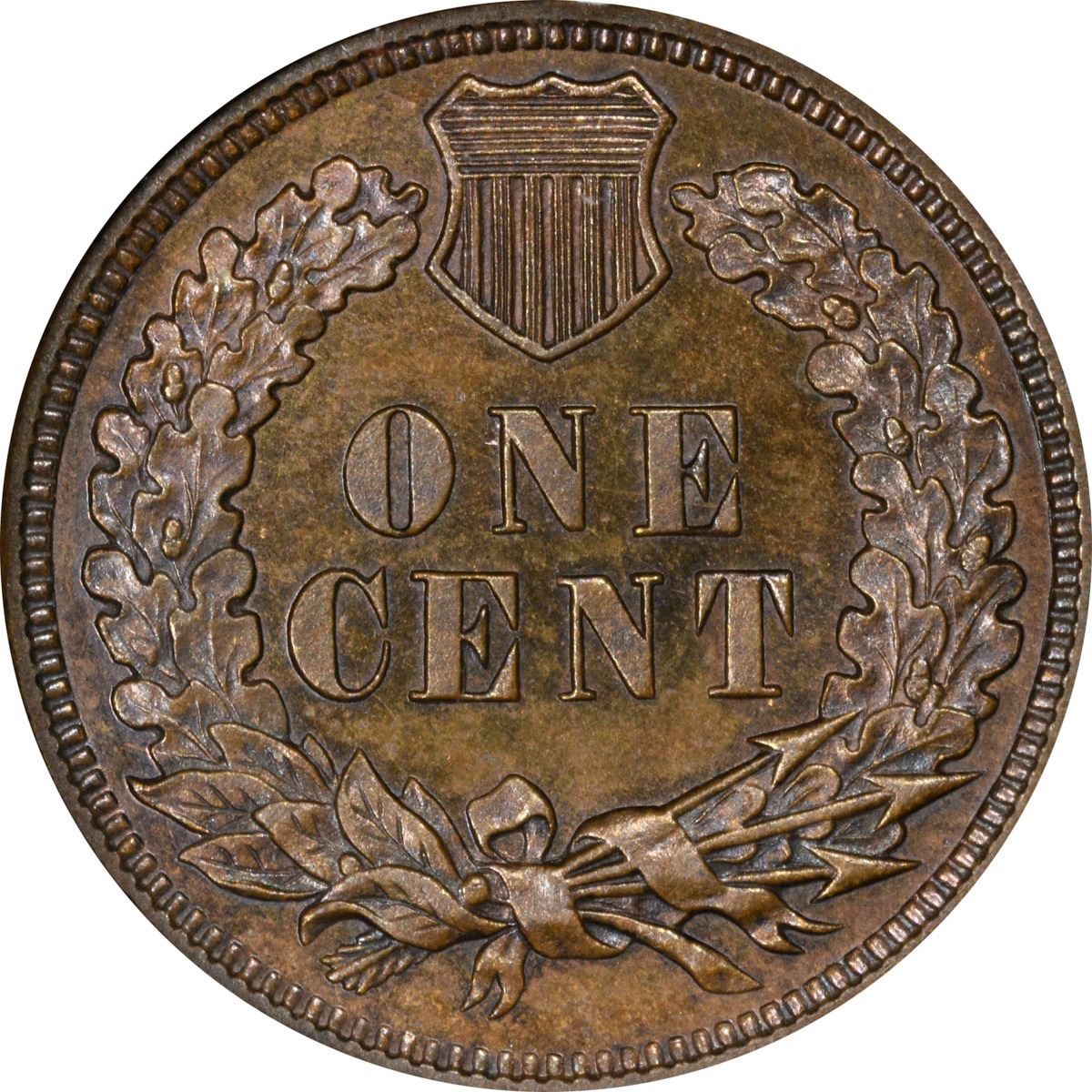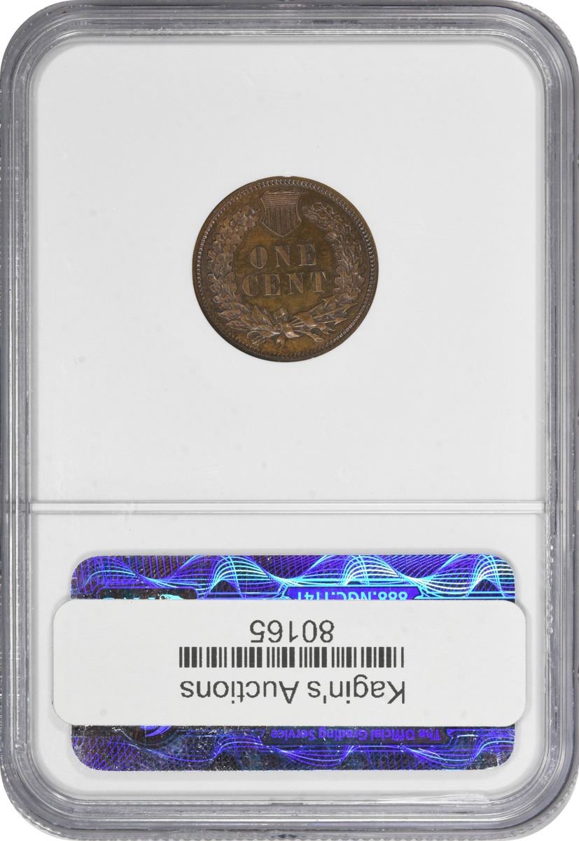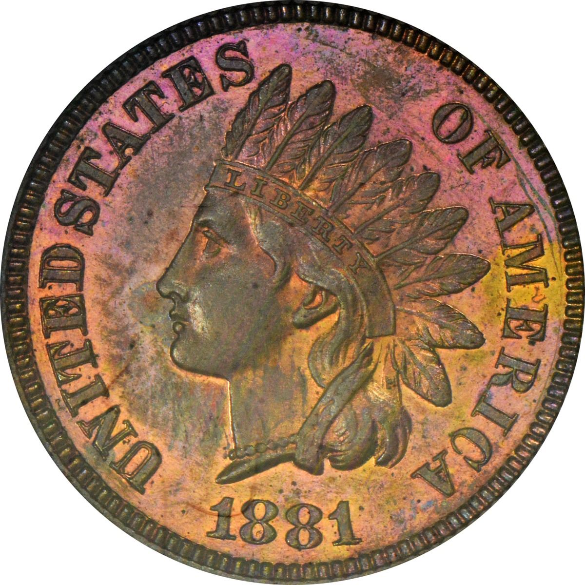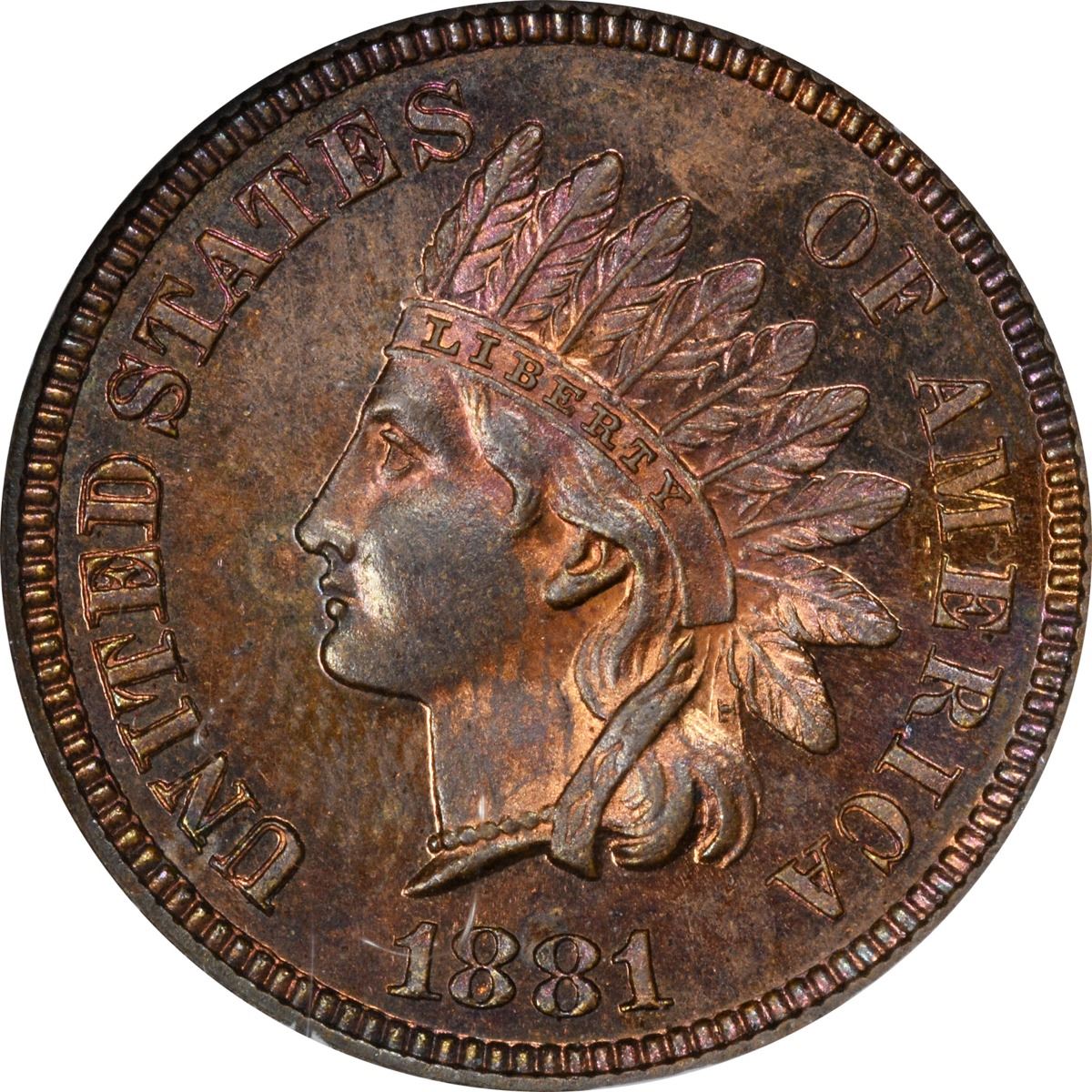 1881 Indian 1¢. Proof-64 RB NGC. The reflective obverse displays a generous amount of rose-orange mingled with deep tan, while the reverse is mostly deep tan and warm brown throughout.