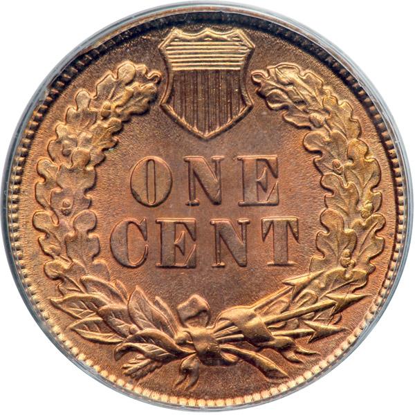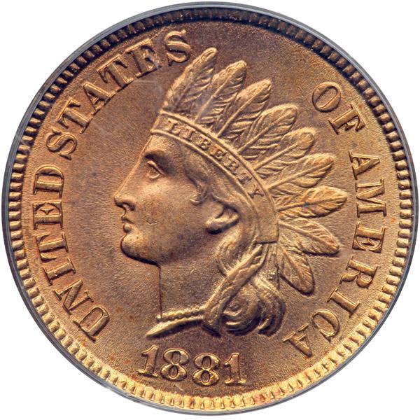 1881 Indian Head Cent. PCGS graded MS-66 Red. Accompanied by an Eagle Eye certificate. Housed in an Old Green Holder. A lovely red coin. Vivid coppery shades of red and gold vie for dominance on this fresh and colorful gem. A frosty specimen with nary a sign of handling (or mishandling). Sharp detail on all devices is typical for this 1881 issue although business strikes aren't nearly as sharp as the Proofs; however, with present specimen we see a wonderful combining in the broad regions of crisp strike found on the devices with rare degrees of fresh red color. A remarkable coin. Pop 22; 4 finer in 67RD (PCGS # 2141) .