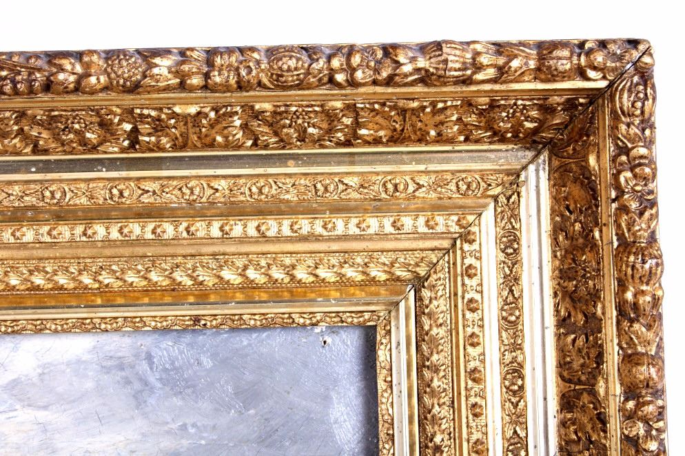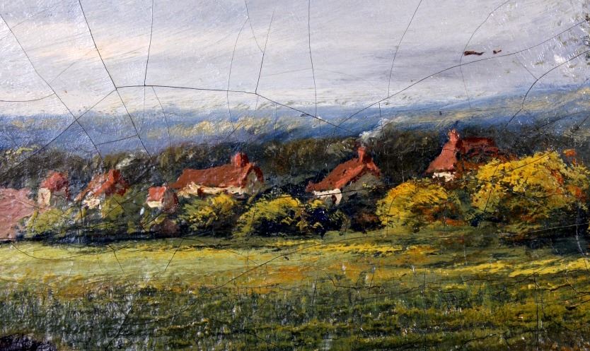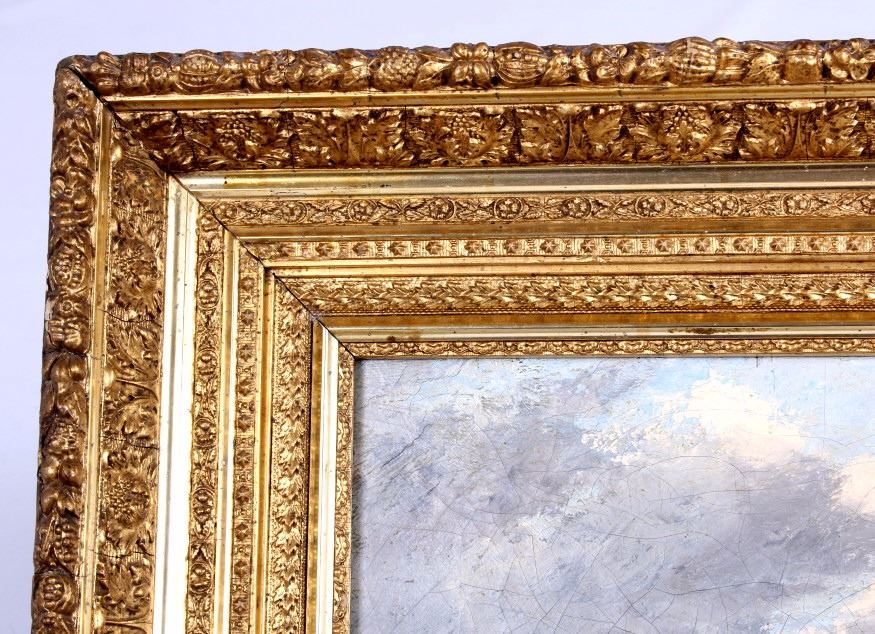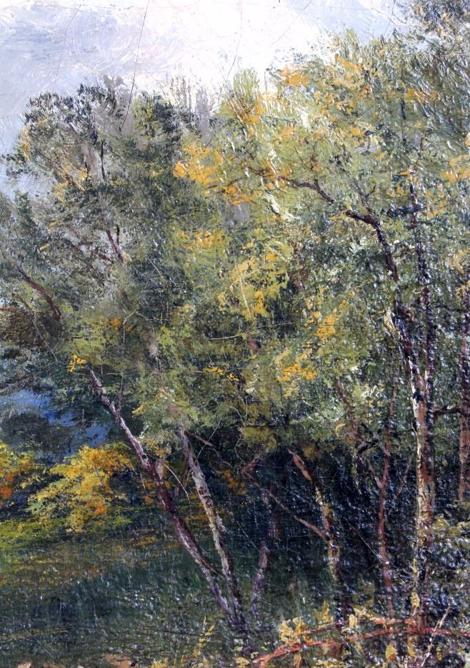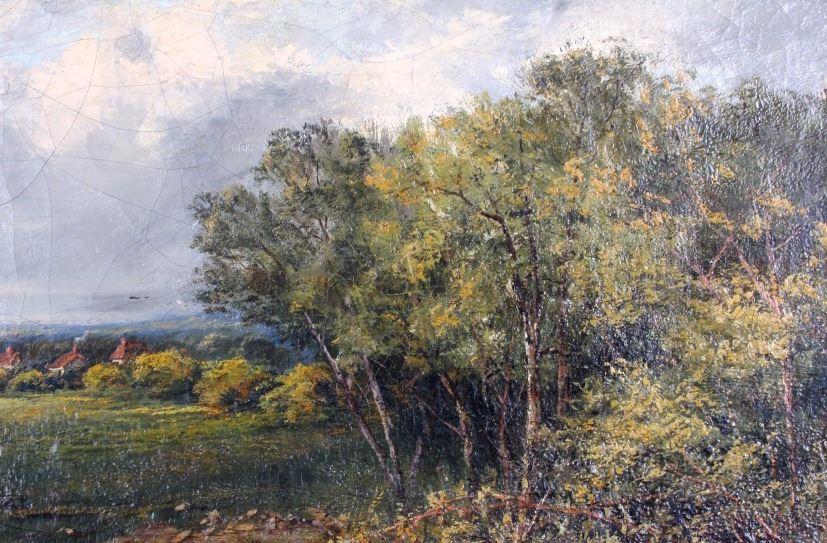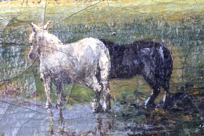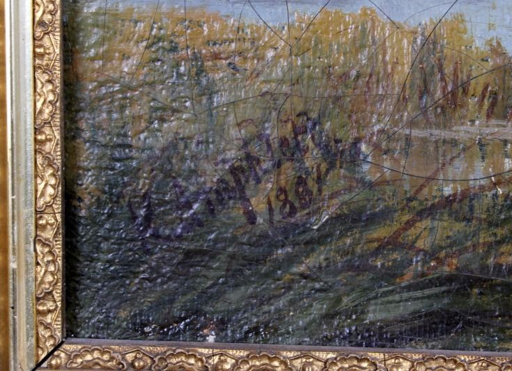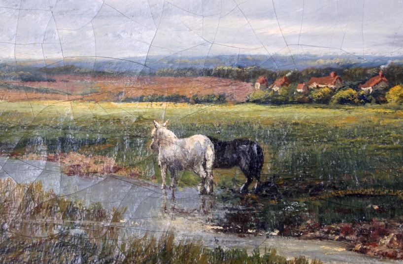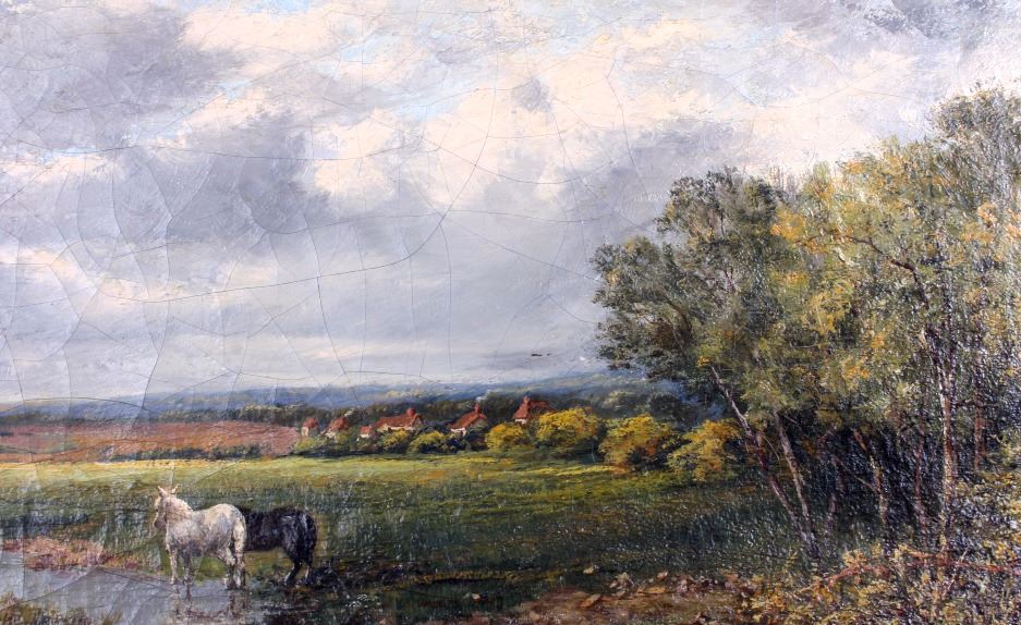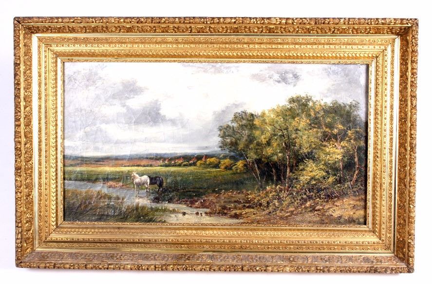 This is an original Kate Amphlett oil on board painting from 1881. The painting shows a wonderful English countryside landscape with two horses along the banks of a stream. The painting is set in a wonderful gilt frame. The painting is in good overall condition. The paint does shows some cracking. The painting is signed in the lower left corner "K. Amphlett 1881". The frame measures 24" x 37.75".