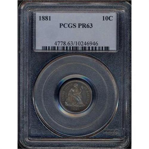 <b>1881 Liberty Seated Dime. PCGS graded Proof 63.</b> Another from the same old-time collection, a coin with layers of natural deep blue and gray patina atop the smooth, mirror finish and sharp design relief. A few little hairlines wouldn't turn most collectors away <b>(PCGS # 4778)</b> <i>