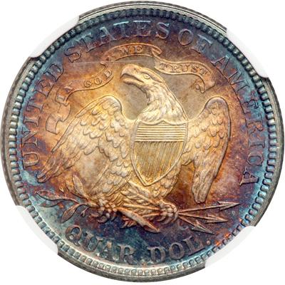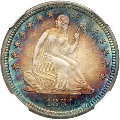 1881 Liberty Seated Quarter Dollar. NGC graded MS-67. Star. Lovely rainbow toning. Only 12,975 pieces minted. An immaculate, spinning-fresh Superb Gem, the surfaces spread light with vivid wintry white originality over both sides at the centers as the color deepens toward the outer margin. No more than the luster comes a desirable strike: This piece is struck with scientific exactness throughout the main devices, including both shields and nearly all stars (only a few at the upper left showing any softness. The low-mintage rarities of 1879-89 have caused quite a lot of attention over the years. And when a superb one like this comes along, it turns heads! In a new 4 pronged NGC holder.Pop 1; 1 finer in 68 Star.