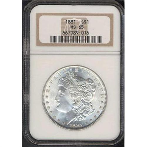 <b>1881 Morgan Dollar. NGC graded MS65.</b> Untoned and refreshingly clean for this 1881 date, with glinting luster in the fields and chalk-white devices. The fields are silver, untoned, and satin with much cartwheel luster. In light of that, we can also say this piece is nicely struck with extremely full details on both sides <b>(PCGS # 7124)</b>