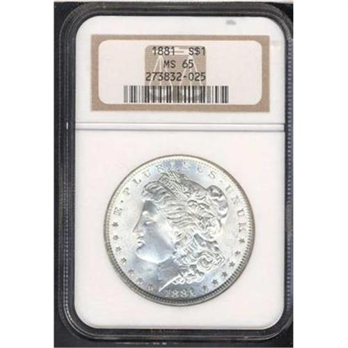 <b>1881 Morgan Dollar. NGC graded MS65.</b> Brilliant and refreshingly clean for this slightly better P-mint issue, with flickering white luster in the fields and moon-white gem-quality devices. The fields are silvery, untoned, and satin with much eye-appeal, in fact. And if you were worried the design left by the dies to be deficient in robustness, take heart, since this is an exceptional 1881 silver dollar and not the usual run-of-the-mill strike. It is, indeed, very bold <b>(PCGS # 7124)</b>