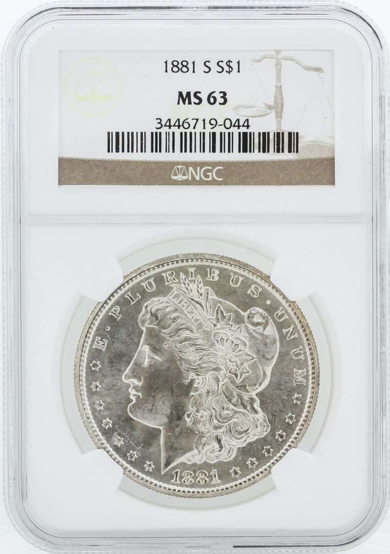 One 1881 NGC MS63 Morgan Silver Dollar.