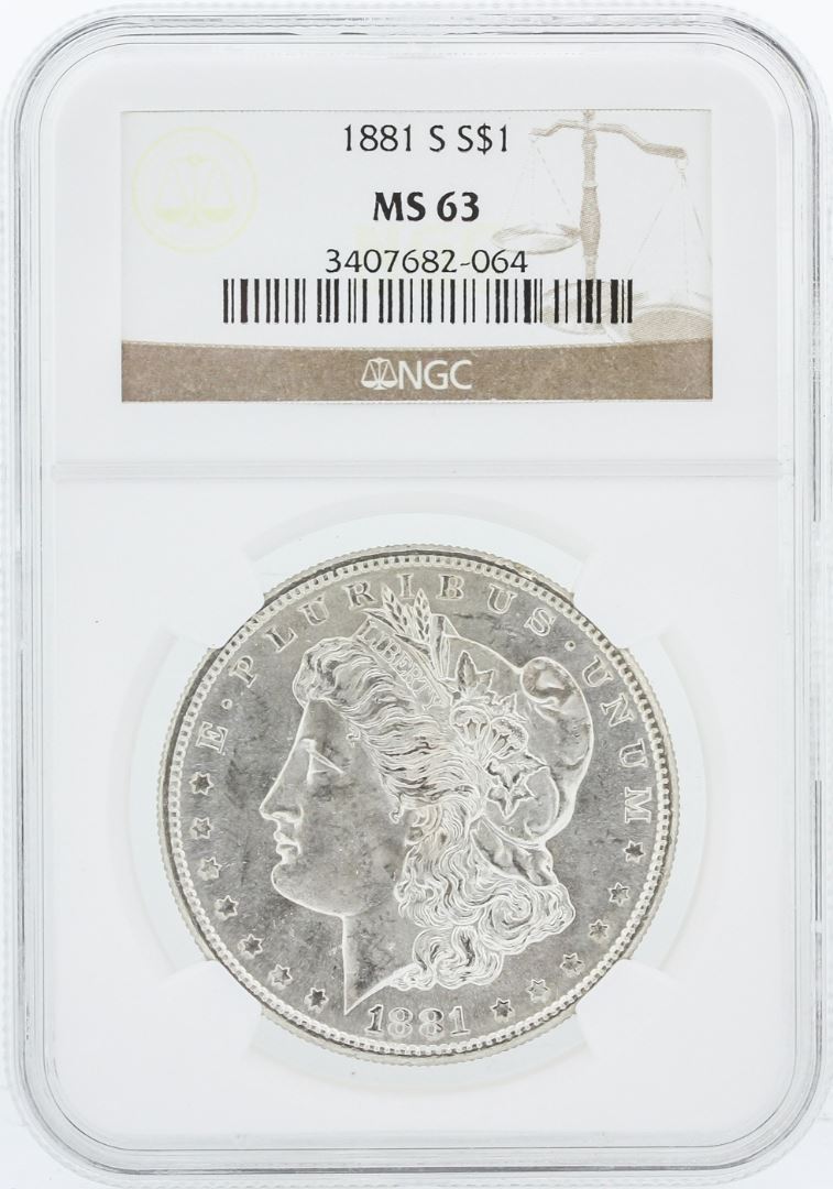 One 1881 NGC MS63 Morgan Silver Dollar.