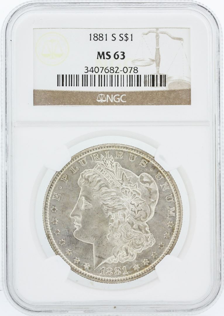 One 1881 NGC MS63 Morgan Silver Dollar.