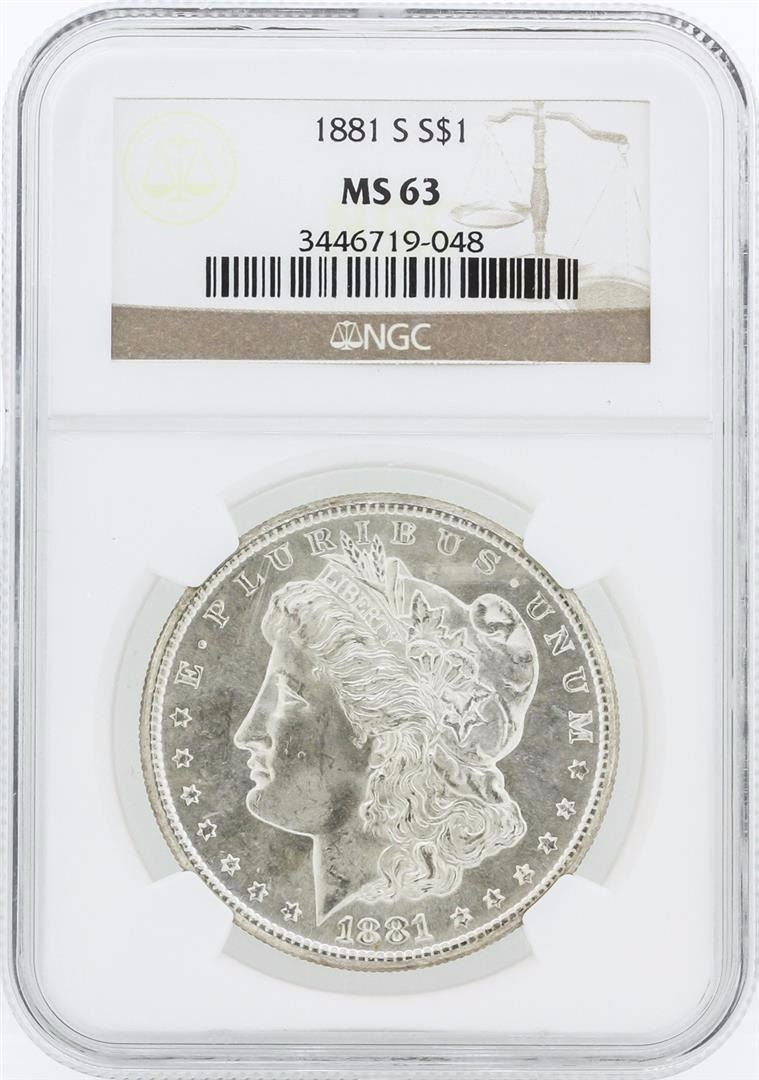 One 1881 NGC MS63 Morgan Silver Dollar.