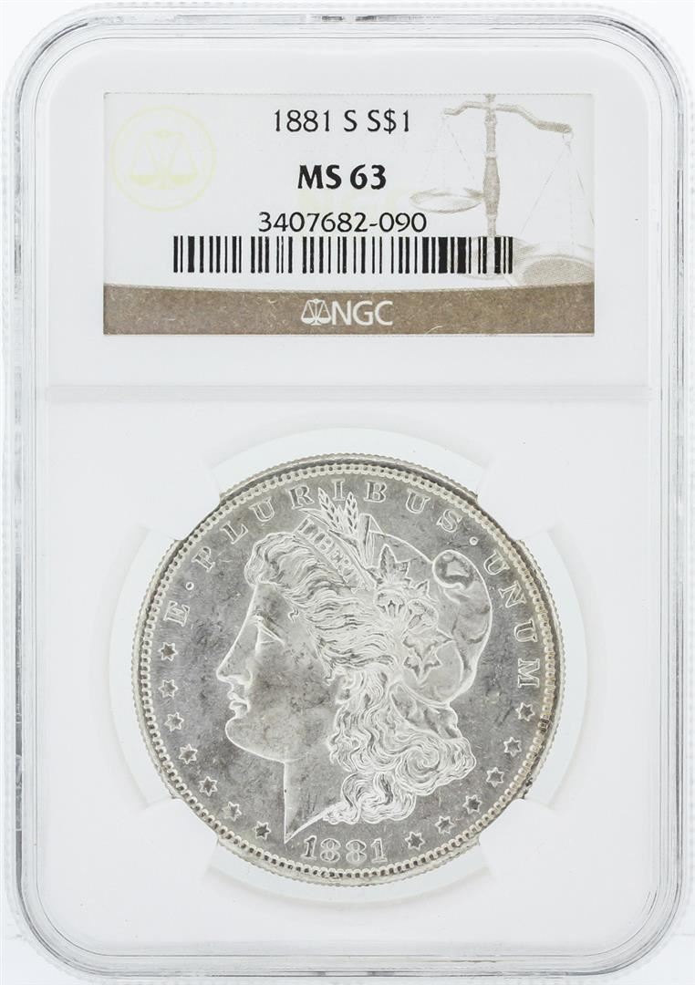 One 1881 NGC MS63 Morgan Silver Dollar.