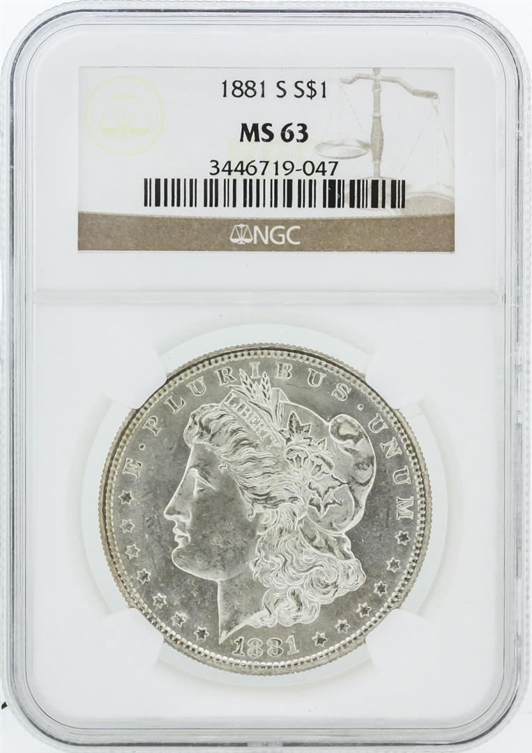 One 1881 NGC MS63 Morgan Silver Dollar.