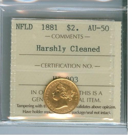 1881 Nfld $2 Gold ICCS AU50. Designated Harshly Cleaned.