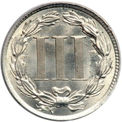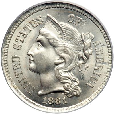 1881 Nickel Three Cents. PCGS graded MS-64. Lustrous nickel-gray hue with sharp detail on the Roman numeral and wreath (PCGS # 3749) .