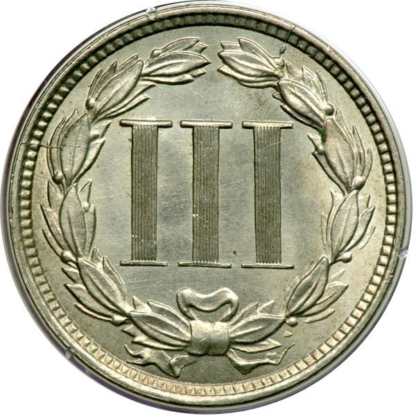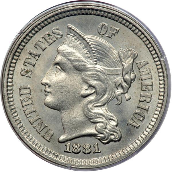 1881 Nickel Three Cents. PCGS graded MS-65 PQ. Housed in a First Generation Holder. Well struck and choice. Pop 70; 50 finer (PCGS # 3749) .