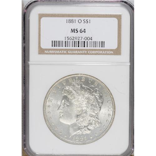 <B>1881-O $1 MS64 NGC.</B></I> NGC Census: (3194/435). PCGS Population (2432/435). Mintage: 5,708,000. Numismedia Wsl. Price: $129. (#7128)<BR><BR><b>Shipping:</b> Coins & Currency (<a target="_blank" href="http://www.heritageauctions.com/common/shipping.php">view shipping information</a>)