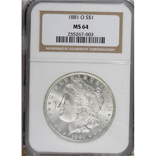 <B>1881-O $1 MS64 NGC.</B></I> NGC Census: (3225/443). PCGS Population (2425/408). Mintage: 5,708,000. Numismedia Wsl. Price for NGC/PCGS coin in MS64: $129. (#7128)<BR><BR><b>Shipping:</b> Coins & Currency (<a target="_blank" href="http://www.heritageauctions.com/common/shipping.php">view shipping information</a>)