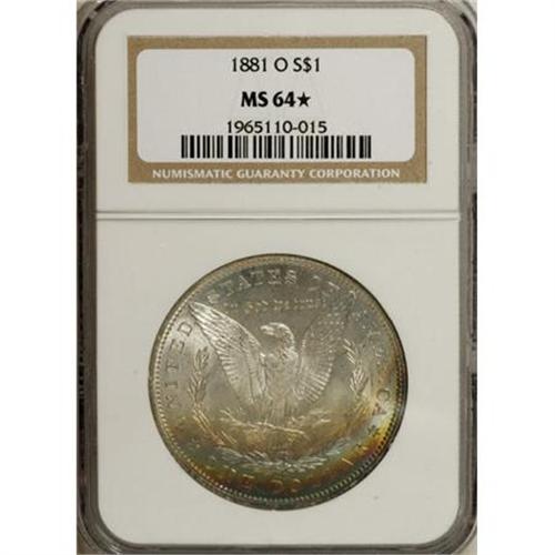 <B>1881-O $1 MS64 <img border='0' src='http://www.heritagecoins.com/images/star.gif' width=10 height=10> NGC.</B></I> NGC Census: (3236/444). PCGS Population (2443/431). Mintage: 5,708,000. Numismedia Wsl. Price for NGC/PCGS coin in MS64: $135. (#7128)<BR><BR><B>Coin Engraver:</B> George T. Morgan<BR><BR><b>Shipping:</b> Coins & Currency (<a target="_blank" href="http://www.heritageauctions.com/common/shipping.php">view shipping information</a>\)