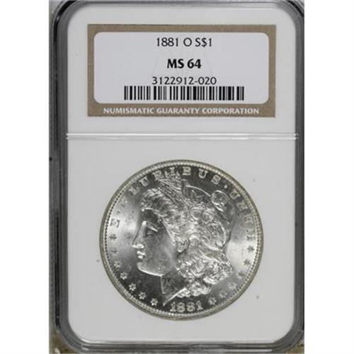 <B>1881-O $1 MS64 NGC.</B></I> NGC Census: (3306/448). PCGS Population (2551/491). Mintage: 5,708,000. Numismedia Wsl. Price for NGC/PCGS coin in MS64: $135. (#7128)<BR><BR><B>Coin Engraver:</B> George T. Morgan<BR><BR><b>Shipping:</b> Coins & Currency (<a target="_blank" href="http://www.heritageauctions.com/common/shipping.php">view shipping information</a>)