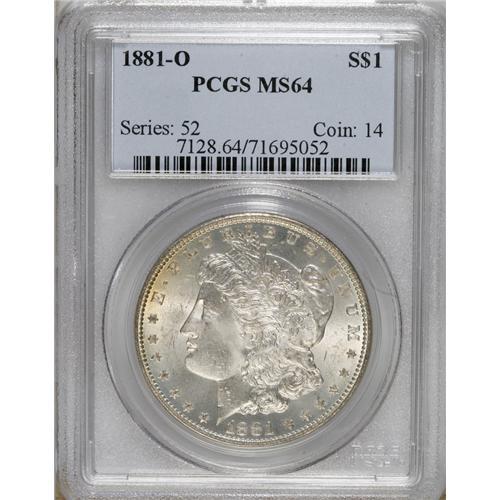 <B>1881-O $1 MS64 PCGS.</B></I> PCGS Population (2426/408). NGC Census: (3209/443). Mintage: 5,708,000. Numismedia Wsl. Price for NGC/PCGS coin in MS64: $129. (#7128)<BR><BR><b>Shipping:</b> Coins & Currency (<a target="_blank" href="http://www.heritageauctions.com/common/shipping.php">view shipping information</a>)